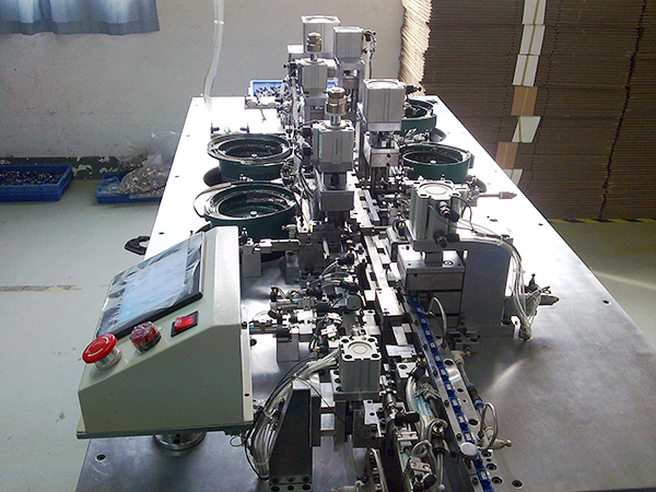 本系列機器是專業生產組裝VGA(D-SUB)產品,采用定位撥料移料,振動盤送塑膠鉚釘尖形片鐵殼,從塑膠進料,送端子,切夾端子,插端子,鉚壓,折彎,切料帶,裝后蓋,裝鐵殼,裝尖形片,裝鉚壓,鉚壓,電測,出料。